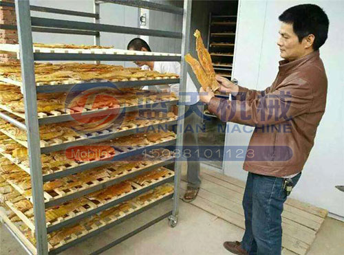 把處理過的竹筍均勻有序的擺放在不銹鋼托盤上,把推車推入烘干房內(nèi),在烘干的過程中,溫度控制在45-60度,烘干時(shí)間為48個(gè)小時(shí),直至竹筍呈金黃色就表示烘干完成,鮮筍的水份含量較大,通過壓制在烘干,時(shí)間會(huì)縮短不少。