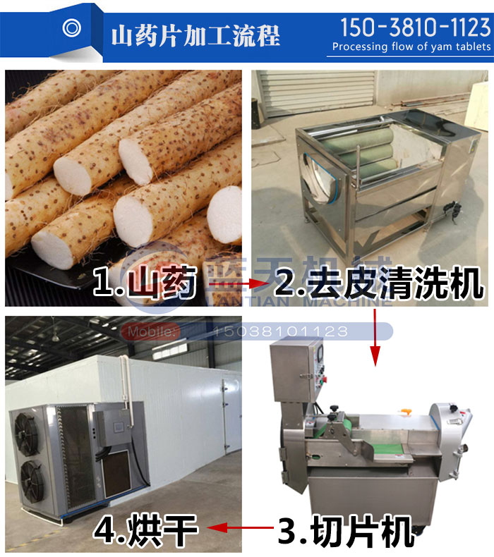 選取條直、粗壯、無腐爛、無霉變斑點(diǎn)的新鮮山藥放入洗滌槽中,用清水洗凈外部的泥土、沙粒等雜質(zhì),然后去皮切片。將切好片的山藥平鋪在烘盤內(nèi),推進(jìn)烘房。將房?jī)?nèi)溫度加熱至50°,加熱30分鐘~1.5小時(shí),濕度升高,注意除濕避免表面硬化,除潮的時(shí)候可以保持恒溫狀態(tài)。